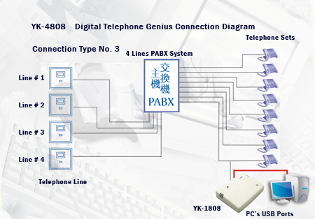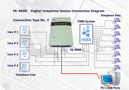 | YK–4808四線用戶亦可將數碼錄音寶接駁到電話系統(PABX System)使用,接駁方式如連接其他型號一樣,一條插入數碼錄音寶機背的其中一個電話線插孔,再把另一條附送的電話線的一端插入電話主機的入線插孔,重覆以上同樣的步驟連接第二/三/四條電話線。再將附送的USB線分別插入錄音寶及電腦的USB埠,最後安裝附送光碟內的驅動程式和應用軟件便可開始操作使用。電話主機後任何一個分機撥出或接聽來電均可進行錄音。 |