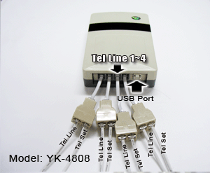 | YK–4808支援四條電話線或四線商業電話系統,接駁方法與其他型號大同小異,用戶可利用"Y"型的分叉器將原連接電話機的電話線拔出,配上分叉器及接好電線,一條插入數碼錄音寶機背的其中一個電話線插孔,再把另一條附送的電話線的一端插入電話機背的插孔,重覆以上同樣的步驟連接第二/三/四條電話線。再將附送的USB線分別插入錄音寶及電腦的USB埠,最後安裝附送光碟內的驅動程式和應用軟件便可開始操作使用。 |