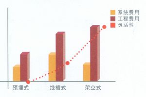 盡管架空地板布線系統與預埋式布線系統費用差不多,但是整個工程包括架空地板費用,所以安裝費用要遠比線槽式地板布線系統要高。